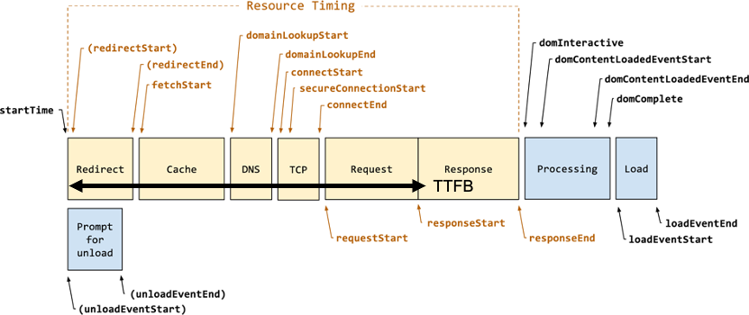 The Time to First Byte (TTFB) is the time it takes a browser to receive the first byte of the web app.