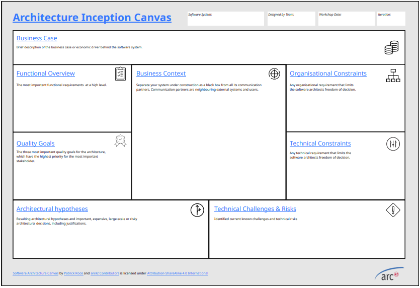 Architecture Inception Canvas: Captures the initial architecture playground, including business drivers and constraints.