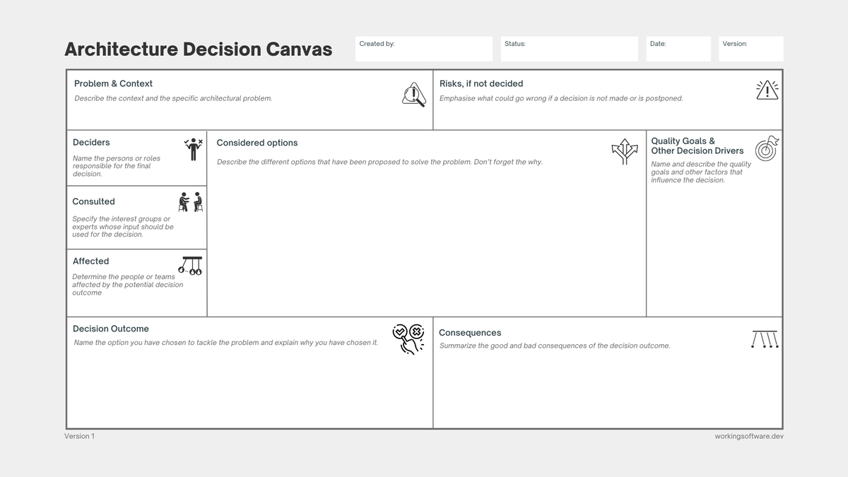 Architecture Decision Canvas: The Architecture Decision Canvas guides software teams through the fog of architecture decisions and ensures that decisions are not just made, but made with intention, understanding and foresight.