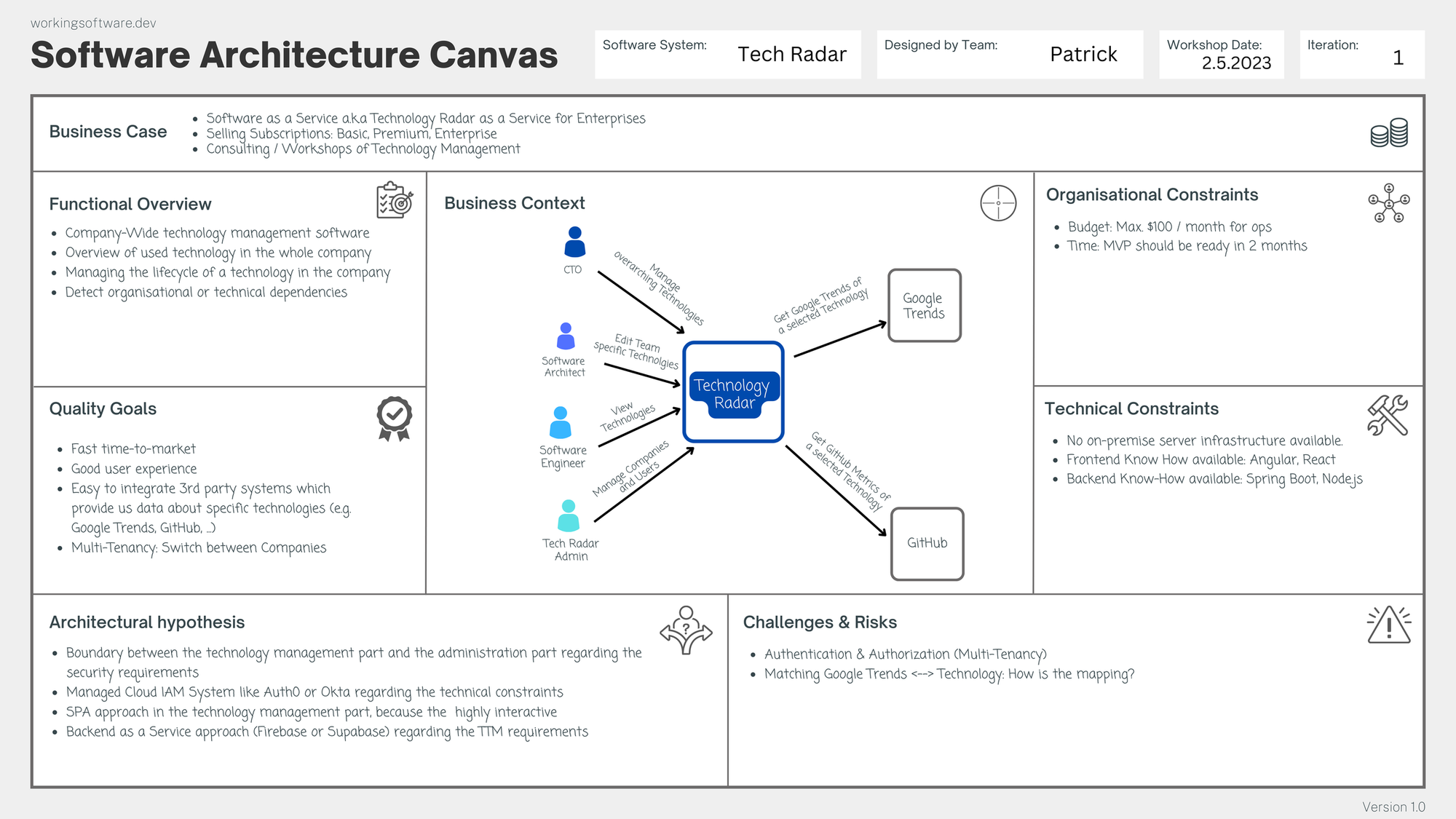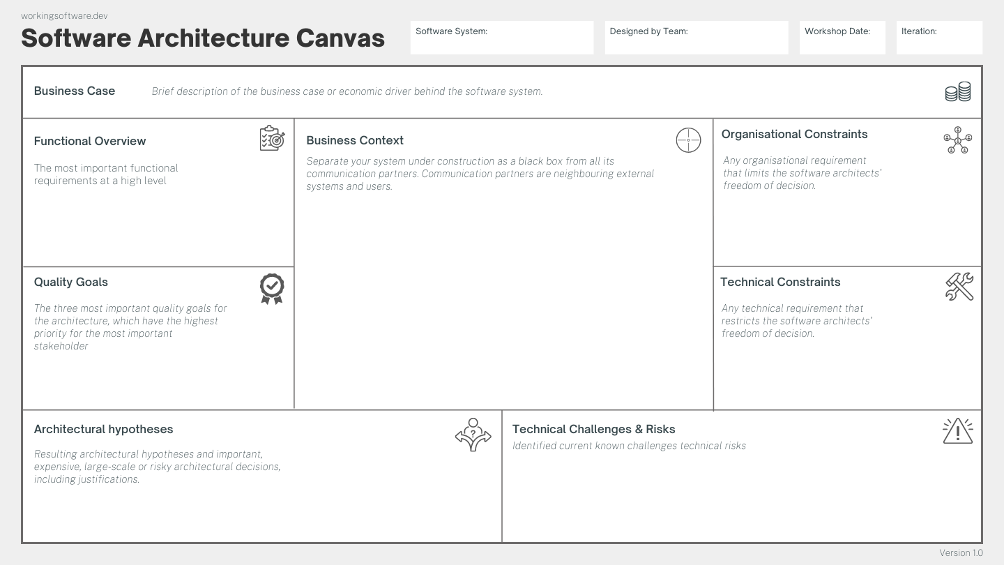 That's why I developed the Software Architecture Canvas, which helps product teams lay the groundwork for software architecture in an efficient and collaborative way.