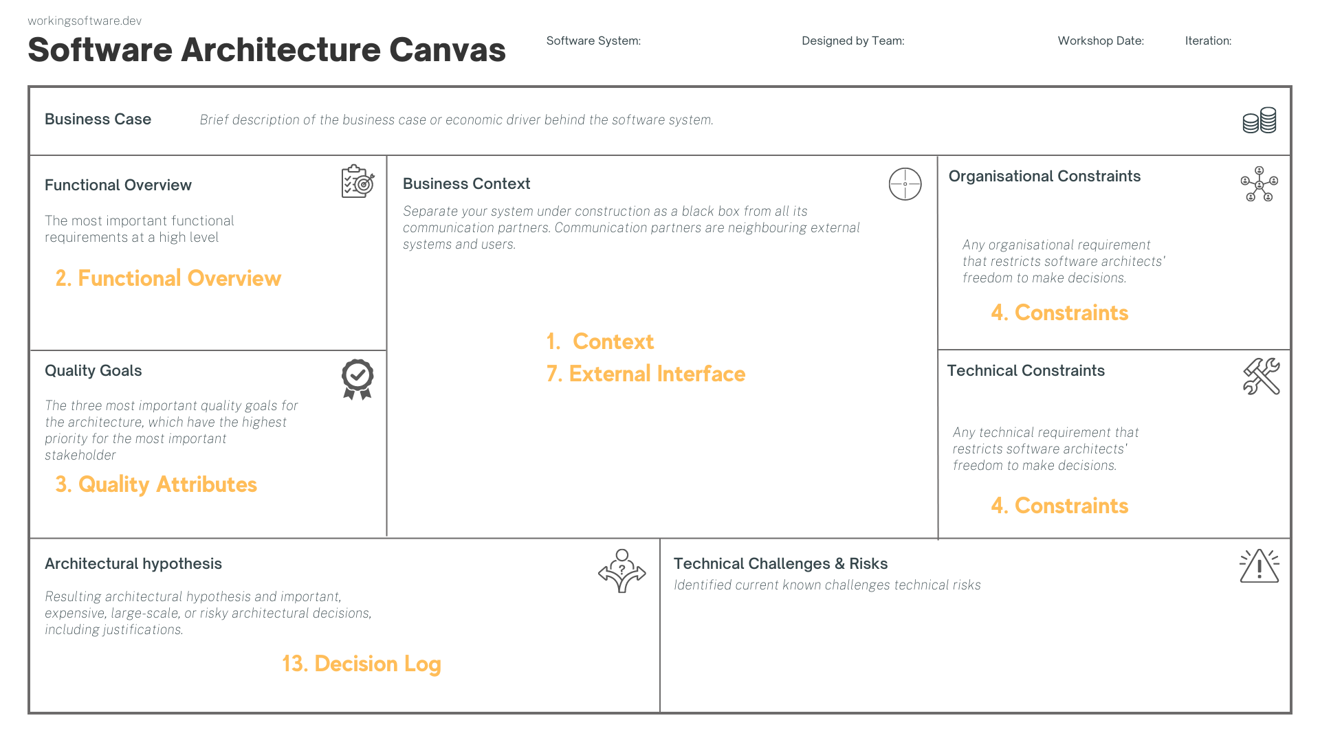 You can find these recommended parts of the guide on the Software Architecture Canvas, which you can map directly.