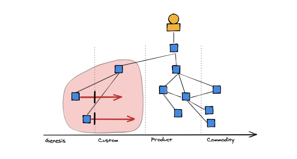At its core, Wardley Mapping is based on the idea that everything in a business evolves over time, from genesis (the initial idea or concept) to custom-built solutions to products and services that are widely available and become commodities.