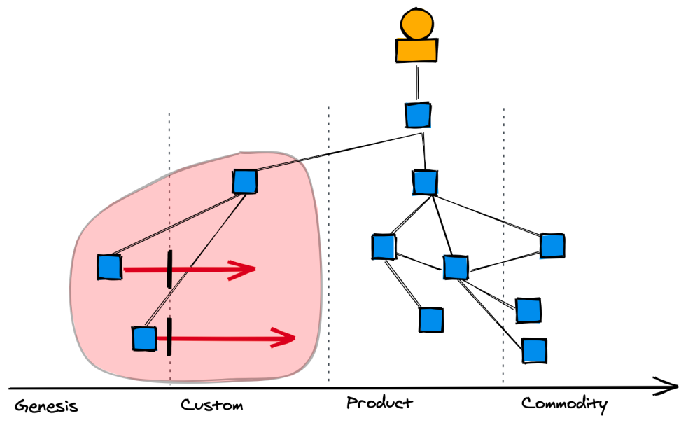At its core, Wardley Mapping is based on the idea that everything in a business evolves over time, from genesis (the initial idea or concept) to custom-built solutions to products and services that are widely available and become commodities.