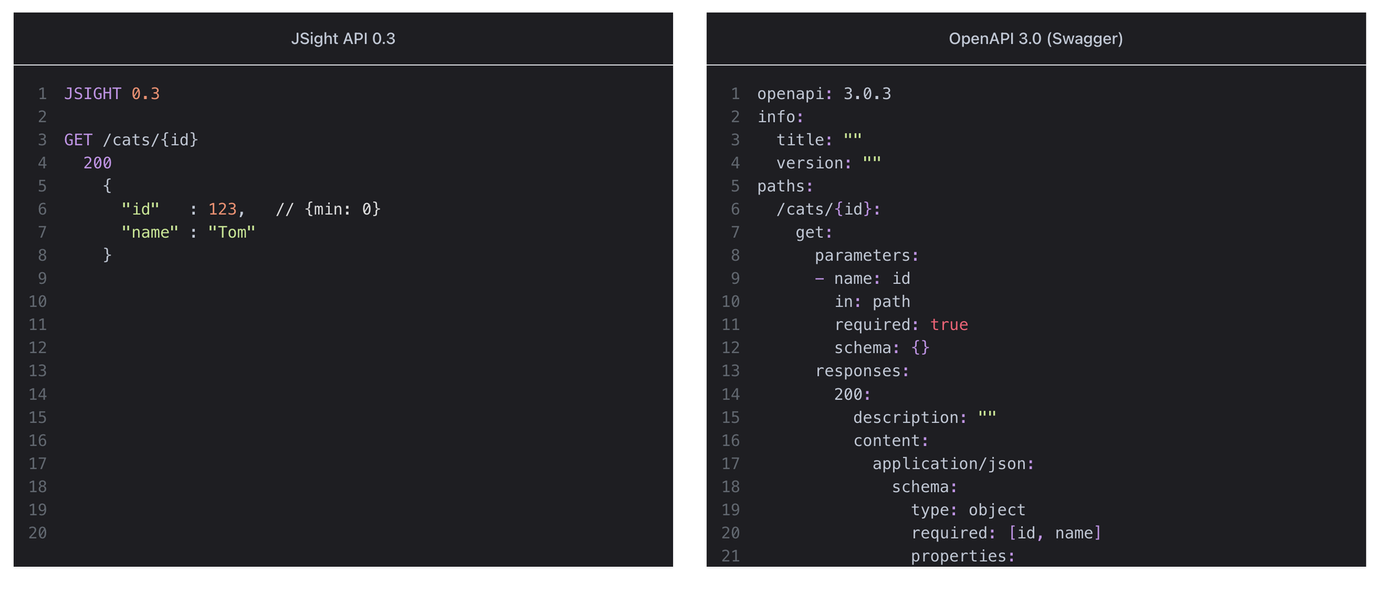 Software developers often don't like to document APIs. The OpenAPI specification is one of the most widely used specifications to describe REST APIs. However, the OpenAPI specification comes with some documentation overhead. For example, it takes almost 23 lines of code to describe a simple GET endpoint. JSight minimizes this documentation overhead.