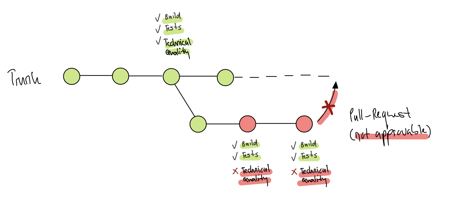 Related problems must be identified using these metrics. With a large codebase, these issues can only be identified automatically as part of your build and deployment pipeline. The following figure shows how you can protect your trunk with an automated technical quality check. If the technical quality check of a feature or bug fix branch fails, no one can merge it to the trunk. Each time a commit occurs, a report is generated with the above metrics.